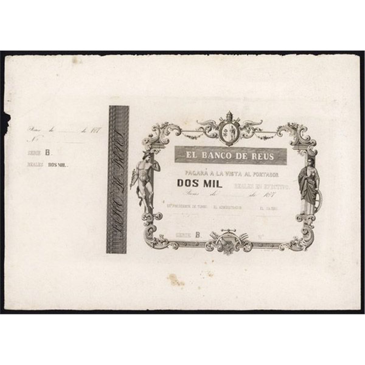 Reus, Spain, 187x (ca. 1870's), 2000 Reales De Vellon, Serie B, Proof, Black with no underprint printed on large margined white paper, Arms on top with Standing allegorical Mercury on left and woman on right, counterfoil on left, Uncirculated condition with toning spots near bottom. Unpriced in SCWPM and evidently a rare note in any condition.