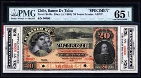 Talca, Chile. 18xx, (ca.1888). 20 Pesos, P-S441s, Black on orange and yellow green underprint, portrait of young women on left, mountain in middle and man lower right. Specimen overprint and "00000" serial numbers with POC. Counterfoils on left and right. Archival notations on left border. PMG graded "65 EPQ" Gem Uncirculated, Exceptional Paper Quality. Extremely rare note that is unpriced in SCWPM. ABNC.
