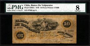 Valparaiso, Chile. 3.1.1876, 10 Pesos, P-Unlisted Banknote Denomination but from the 1876 Series, Issued banknote. Yellow border and underprint with black allegorical vignette of seated woman flanked by small locomotive and coastline scene, black circular handstamp on the upper middle left, back black on yellow underprint, Mercury standing with torch in middle. The SCWPM has a 5 Pesos banknote listed with a similar design but the 10 Pesos is a different design and 1877 date. PMG graded "8" Very Good. S/N 07860. PMG listed the note as Pick-S489A, but I think it should have been listed as P-488B. Extremely rare if not unique. National Bank Note Company, New York (NBNC). This could very possibly be the only one available.