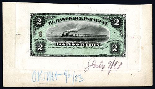 Asuncion, Paraguay. 1882. 2 Pesos, P-S126p, Proof printed on india paper mounted on large card, black on green underprint, Locomotive right to left. The letter “B” has been pasted to the left middle. Unique model of this extremely rare banknote with archival approval signatures on bottom with “July 9/(18)83 date. Light handling from archival production file, but note looks AU+ to Uncirculated. Rare and unpriced in SCWPM. ABNC. A prize for any advanced Paraguay collector.