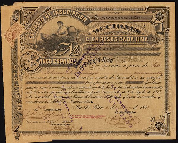 Puerto Rico, 1894, 50 Shares, Issued stock, Extracto De Inscripcion, Black on dark green underprint, seated allegorical woman with globe on upper left, revenue stamp on top left margin with curved cut left margin that is glued back to the left edge, signed by officials of bank, VG condition with toning and edge faults on bottom left margin, rare and early Puerto Rico bank shares and first time seen by cataloger.