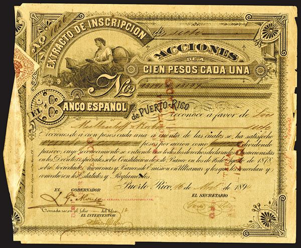 Puerto Rico, 1894, 25Shares, Issued stock, Extracto De Inscripcion, Black on light brown underprint, seated allegorical woman with globe on upper left, revenue stamp on top left margin with curved cut left margin, signed by officials of bank, VG to Fine condition with toning and edge faults on right margin, rare and early Puerto Rico bank shares and first time seen by cataloger.