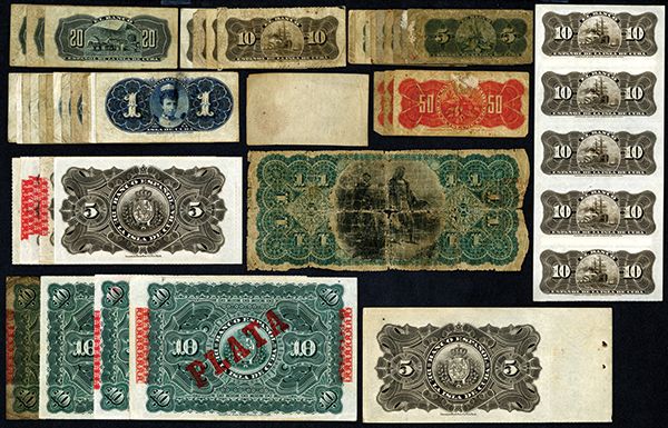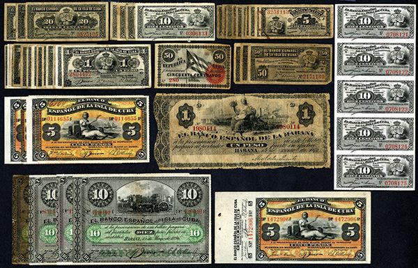 El Banco Espanol de la Isla de Cuba, 1869-1897, Group of 50 Cuba, lot of 50 issued notes, mostly from the 1896 issue, includes 50 Centavos, 1869; 1 Peso, 1872, P-27A; as well as the 5-10-20-50 Centavos and 1 Peso of the 1896-97 issue, with several duplicates of each. Also includes 10 Centavos, P-52, uncut sheet of 5. Mostly Fine-VF, with some UNC. ABNC.