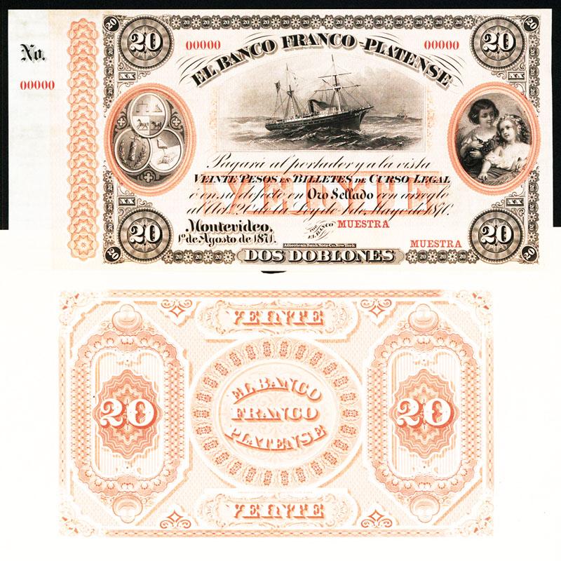 El Banco Franco-Plantense, 1870 Issue Proof.Montevideo, Uruguay, 1870, 20 Pesos, P-S173p, Unlisted face and back Proofs, printed in black on orange underprint on india paper only for the front and india paper on thin card with large margins, steamship in middle, young girls on right, arms at left, POC's, Muestra overprint, Uncirculated to CU condition, very attractive. ABNC.
