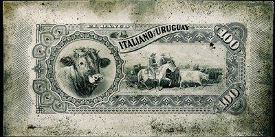 Uruguay. Unique El Banco Italiano Del Uruguay printing plate for back of note. 1887. P-215. 100 Pesos. Back Plate. Vignette of cow on right and vaqueros on horseback with cattle. Cross hatching on left and right. Plate #C-261 on top. 9 by 4.5 inches. Plate is in XF condition with light hairlines from past plate cleaning but no other detracting marks. Rare Uruguay Numismatic item. Unique. ABNC