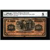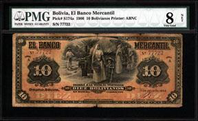 July 19, 1906, 10 Bolivianos, Series A, P-S174a, Unlisted date, Issued banknote, Black on red-orange and yellow underprint, mother and child in village scene, back red with tower in center. PMG graded "8 Very Good NET - Splits", small pieces missing at border where strong folds were located on upper and lower margins, one very small spit in middle approximately 1/4 inch. Rare note issued in any grade. ABNC.