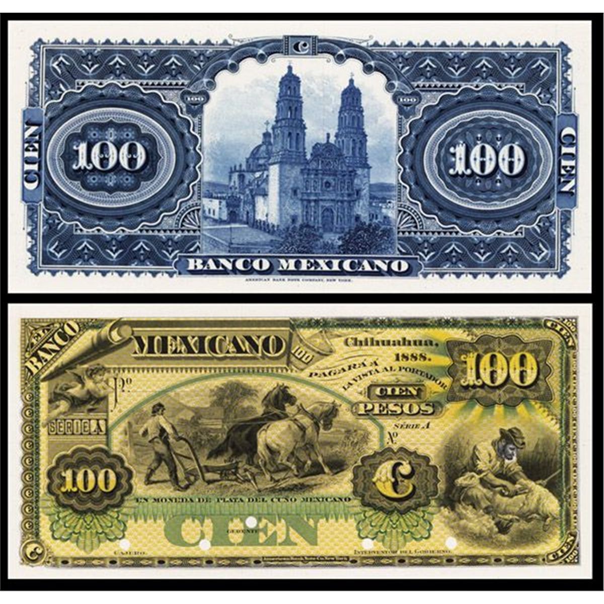 Chihuahua, 1888, 100 Pesos, Series A, P-S159p., Face and Back Proofs. Man plowing with 2 horses on left middle and man shearing sheep on right. Choice uncirculated condition. Printed on india paper on large card. POC. ABNC. Unpriced in SCWPM. Extremely rare and Stunning trophy Mexican Banknote. ABNC.