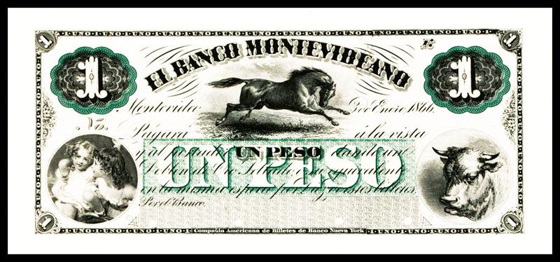 El Banco Montevideano, 1866 Issue Proof.Montevideo, Uruguay, 1866, 1 Peso, P-S353p, Unlisted Uniface face Proof with no back, printed in black on green underprint on india paper on thin card with large margins, 2 children on left, bull on right and running stallion in middle. POC's, Choice to Gem Uncirculated, Attractive and rare note. ABNC.