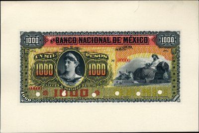 Mexico. El Banco Nacional De Mexico. ND, No series. P-S263p2. 1,000 Pesos Face and back LDP's (Large Die Proofs) printed on india paper on large card. The back is a cut down LDP on india paper only. The face note has POC's. The top of the face proof has a 1/2 inch tear in top margin 1 inch away from banknote, otherwise in choice uncirculated condition. ABNC.