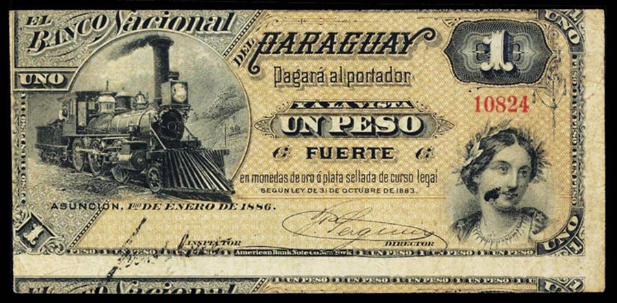 Asuncion. 1st January, 1886. 1 Peso, P-S145 Issued banknote. Black on light brown underprint with locomotive on left and young woman on LR. VG+ to Fine condition, but note has been slightly cut off register toward the top left cutting off a small portion of the top margin. Scarce note that is rarely seen issued. ABNC.