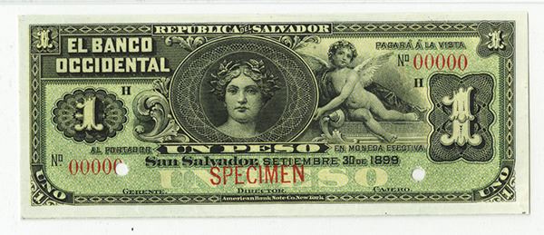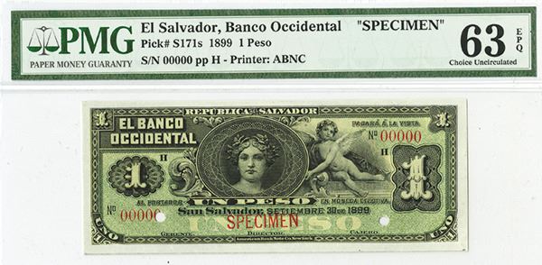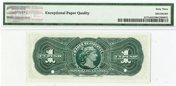 San Salvador, 1899, 1 Peso, P-S171s, Black on green underprint, PMG graded Choice Uncirculated 63 EPQ. Scarce note in any condition. ABNC.