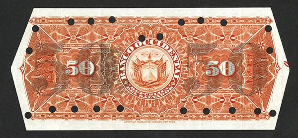 Santa Ana, El Salvador, 50 Pesos, P-S179s, Archival Essay Banknote, Black on light orange with bank at left and harbor scene at right, Back orange with arms at center and "50 - 50" overprinted in black over the back denominations, Choice VF to XF with a 1 inch area of light glue on the face in the middle, Multiple POC's and red "Cancelled" hand written over the note in red, the 4 corners are cut at a slight angle evidently to the shape of the back where the additional overprints were placed and possibly for mounting in a reference book. This note is unpriced in the SCWPM except as a specimen. It may very well be unique with the "50 - 50" overprints on the back. Rare ABN Production department essay banknote. ABNC.