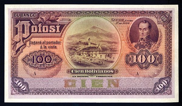 Sucre, Bolivia, 1894. 100 Bolivianos, Ser. A, P-S236s Color Trial and uniface proof printed on white paper. Purple on lilac and m/c instead of issued black on orange, Bolivar on top right and scene of Potosi on middle. Extremely rare and attractive, only known as specimen or proof. CU condition. BWC.