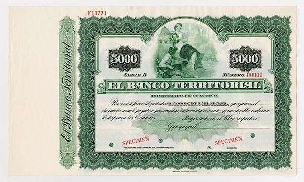 Guayaquil, Ecuador. 5,000 Sucres Specimen Coupon Bond, Black print on green border and under tint printed in Spanish, Allegorical women together at top, Specimen overprints and POC's, VF-XF condition, ABNC.
