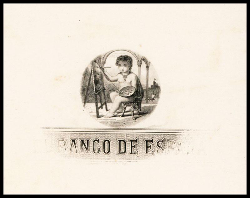El Banco de Espana, 1866 Progress Proof Vignette Banknote Element.Spain, 1 Enero 1866, 10 Escudos, P-Unlisted. Stage proof on card of central portion, particularly the vignette, of an unfinished plate. Ruiz-Alentorn 64 (RRRRR=highest rarity), a unique piece.