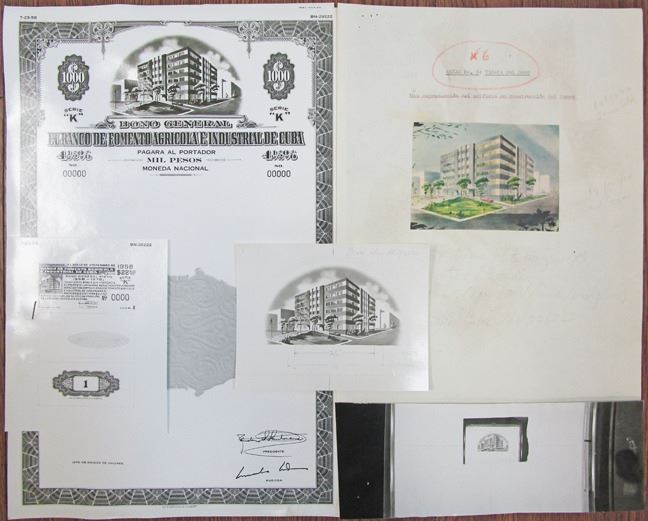 Cuba, 1958. Lot of 7 pieces, Includes: $1,000 Photo Progress Proof 4 1/2% Bond. Black on photo paper with a reproduction of the bank building at top. Included in lot is a colored rendering of the bank building with black and white photocopies. Sold "AS IS" no returns accepted. (7)