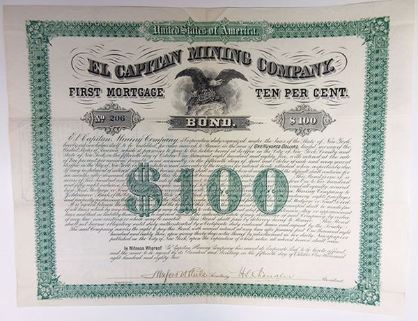 1882. I/U bond. $100, 1st Mortgage 10% Bond. Green border and undertint. Patriotic eagle vignette. XF condition. Coupons attached. Signed by J.Adriance Bush as trustee. He is more well known for being the trustee of the New York and Brooklyn Bridge, representing New York. He is listed on Title page of Opening Ceremonies of the New York and Brooklyn bridge, May 24, 1883 as the Vice President of New York and Brooklyn Bridge. Scarce bond with NY notable's signature.