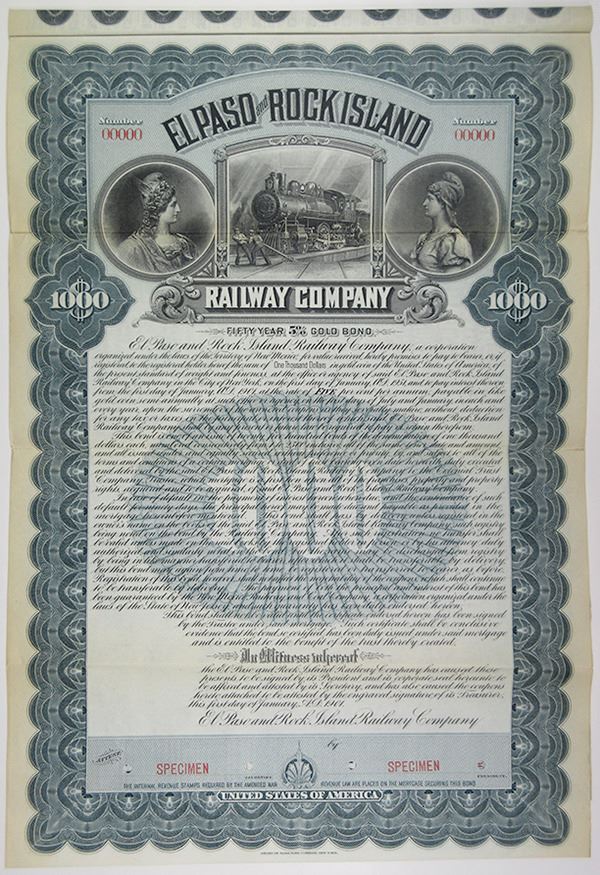 New Mexico. Specimen $1000 50 Year 5% Gold Coupon Bond, Black vignettes and text on blue border and underprint, locomotive on train turntable in middle flanked by Liberty and warrior women, Specimen overprints, POC's, "00000" Serial Numbers. ABNC. This bond variety is the only known type found on this railroad. Only 4 were found in the ABN Archives in 2002. Rare and very desirable New Mexico Territory Railroad.