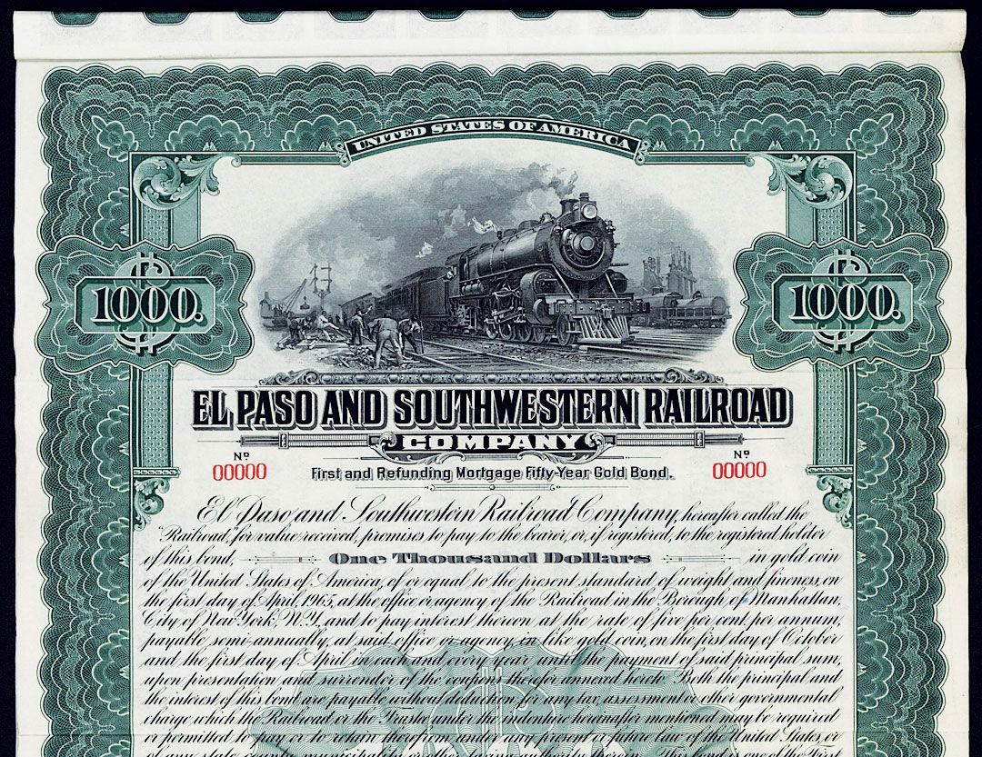 El Paso, Texas, 1915, $1000, Specimen 5% 1st and Refunding Mortgage 50 Year Gold Bond, Black with Green border and underprints, locomotive passing track workers L-R, Specimen overprints, Coupons attached, POC's, XF, ABNC. Only listed as specimen in Cox with this bond, only 3 or 4 specimens total exist including the one listed in Cox. ABNC.