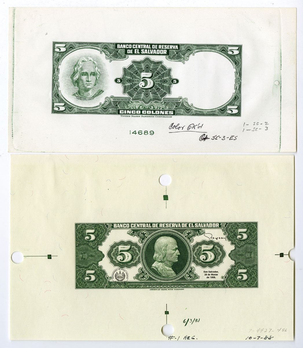 El Salvador, ND (1968 to 1970) to 1981. Lot of 2 Reverse Proof Banknotes, Includes: 5 Colones, ND (1968 to 1970), P-111p, Reverse Proof, Green print with Cristobal Colon at left, #14689, USBNC; 5 Colones, P-134bp, Green print with Christopher Columbus at center, ABNC. Both notes have large margins and range from Choice AU to CU condition. (2). Sold "AS IS" no returns accepted.