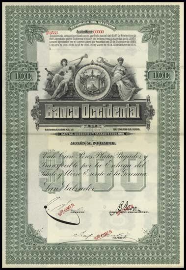 Specimen bond. ND (ca.1905-1915). San Salvador. 100 Silver Pesos. Green border and undertint. Allegorical man and woman flank Arms of El Salvador. Red SPECIMEN overprint and POC. Coupons attached. VF-XF Condition. ABNC.