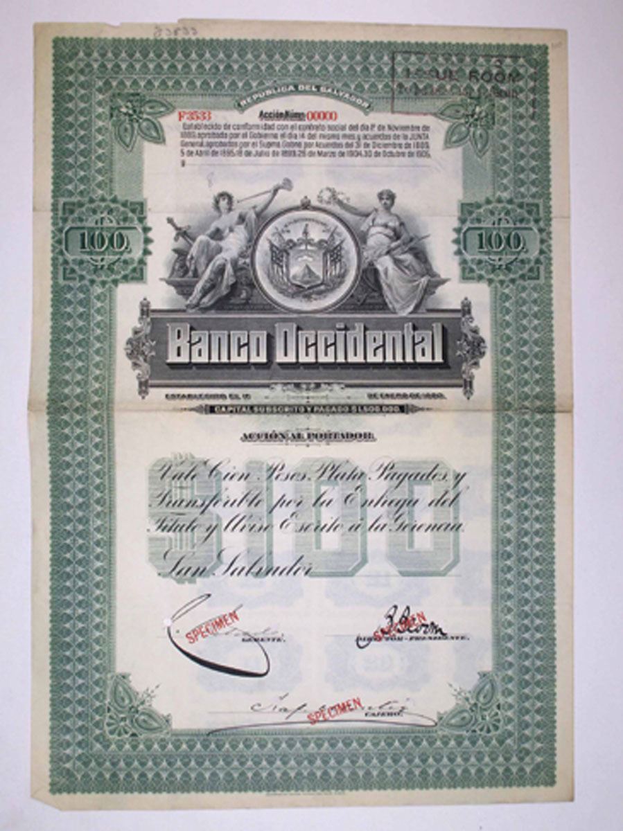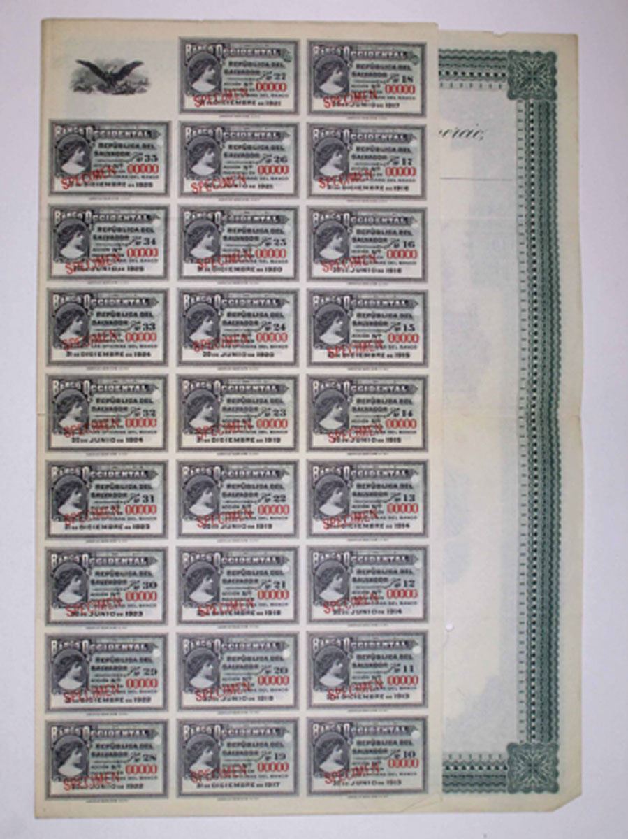 San Salvador, El Salvador, ND (1910-12). 100 Pesos Specimen Coupon Bond, Black print on green border and under tint printed in Spanish, Allegorical figures at top flanking Arms of El Salvador at top center, Specimen overprints and POCs, Good to Fine condition with stains, writing in margins, and archival reinforcement at fold lines, ABNC.