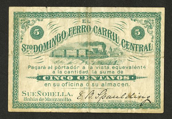 Bahia de Manzanillo, Monte Cristi Province, Dominican Republic, 5 centavos, P-Unlisted, Issued scrip note, Green with locomotive left-right, back red, Choice Fine to VF with a small 2mm split on the top left margin and 2 very small thins on the back, no serial numbers, First time offered by us. Rare D.R. Railroad scrip note.