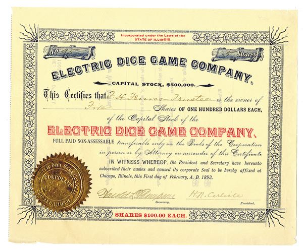 Illinois, 1893. 5 shares I/U Capital Stock Certificate #95, Blue text with blue border, gold seal at bottom left corner. Fine condition. The Electric Dice Game Company manufactured and sold electrical and mechanical gaming devices.