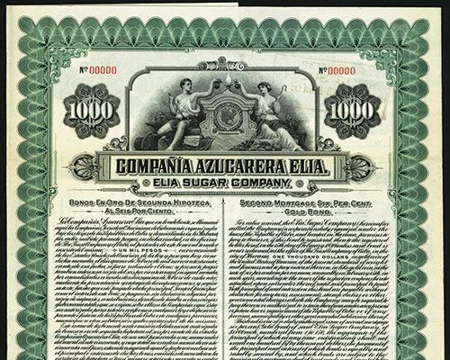 Cuba, 1915, $1000, 2nd Mortgage 6% Gold Specimen Bond, Vertical format, Coupons attached, Black print on green border and underprint, Allegorical figures pouring liquid into flame, Red SPECIMEN overprints and POC's and s/n “00000 “, VF condition ABNC.