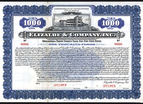 Manila, Philippines. 1938. 1000 Pesos 6% Specimen Bond with coupons attached. Black print with blue border and underprint. Vignette of building on waterway top center. POC's and red SPECIMEN overprints. VF condition with minor splitting. FLABNC. Rare specimen bond.