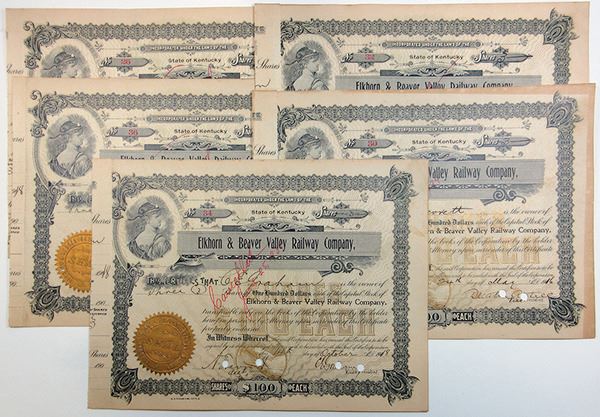 Kentucky, Lot of 5 I/C Stock Certificates, gold underprint and seal, woman with starred tiara, issued, stubs lightly attached, EF, some age toning