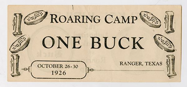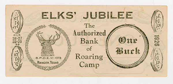 Ranger, Texas, Oct. 26-30, 1926, One Buck ad note. Black printing on beige paper, AU condition.