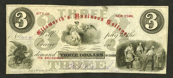 New York, $3, Issued College Currency note that is similar to an obsolete banknote, Black with red title, It was located at 756 Broadway, NYC, Eagle on lower left, allegorical woman with eagle in middle and blacksmith and workers on lower right, Signed by president, hand written in small text is "On receipt of legal funds", S/N 414, Choice VF to XF, Rare college currency variety and first time offered by us.