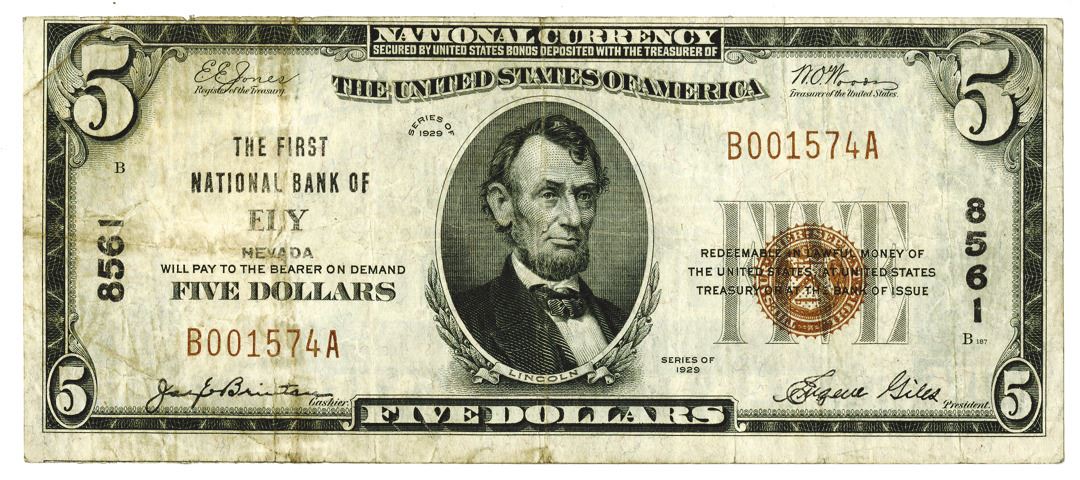 Elko, Nevada. $5, Ch#8561, S/N B001574A, Jones | Woods signatures, VF condition.