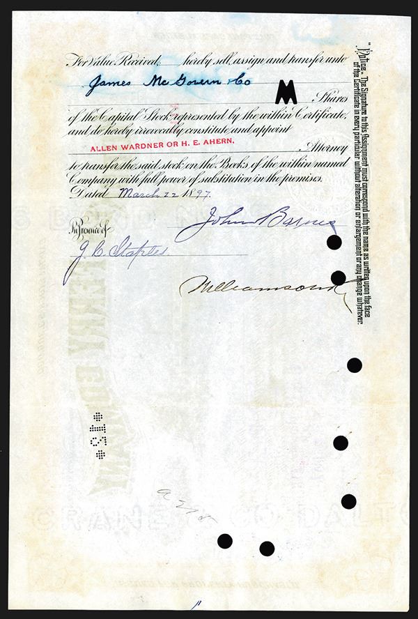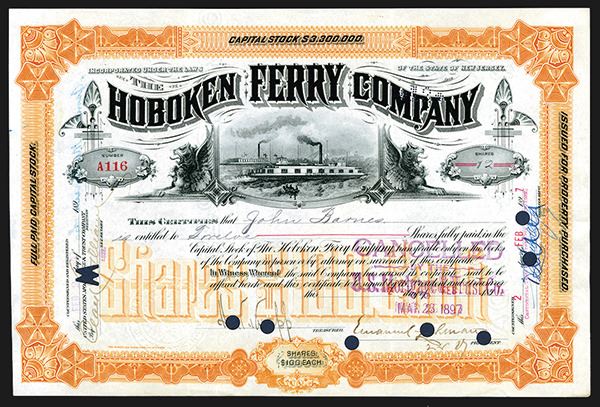 New Jersey, 1897, 12 Shares, I/C stock certificate, Signed by Emanuel Lehman as president. Lehman was a German American banker. The younger brother of Henry Lehman, he was a co-founder of Lehmann Brothers. In 1897, he donated $100,000 (equivalent to $2.8 million in 2012) to the Hebrew Orphan Asylum of New York.