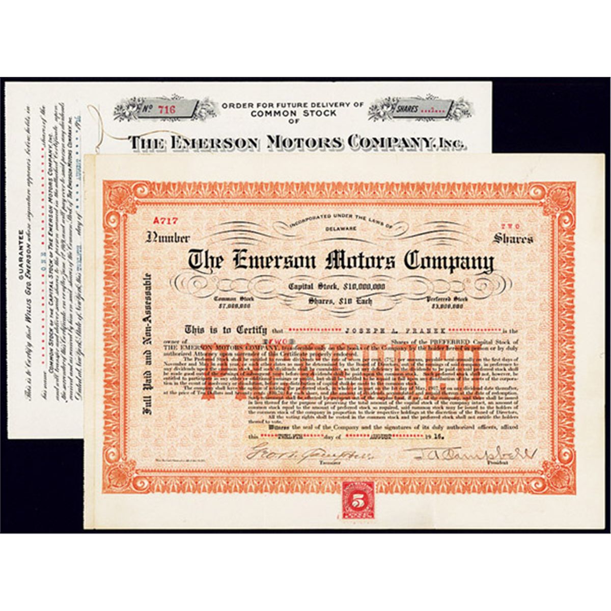 1916, Lot of 2 pieces, Includes 2 Shares, Preferred, Orange border and underprint, no vignette and also an order form for 1 Share of Common Stock that actually looks like a stock certificate itself. Both signed by J.A. Campbell as President . Both in Vf to XF condition.