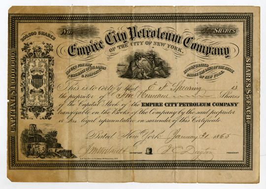 New York, January 31, 1865. 300 Shares I/U Capital Stock Certificate, S/N 485, Black text with black border, Arms of New York city at top center, Oil wells and storage tanks at lower left. Fine condition with toning , L.B. Van Kleeck, Stationer. Company was listed on the New York Petroleum Board. First time seen by us.