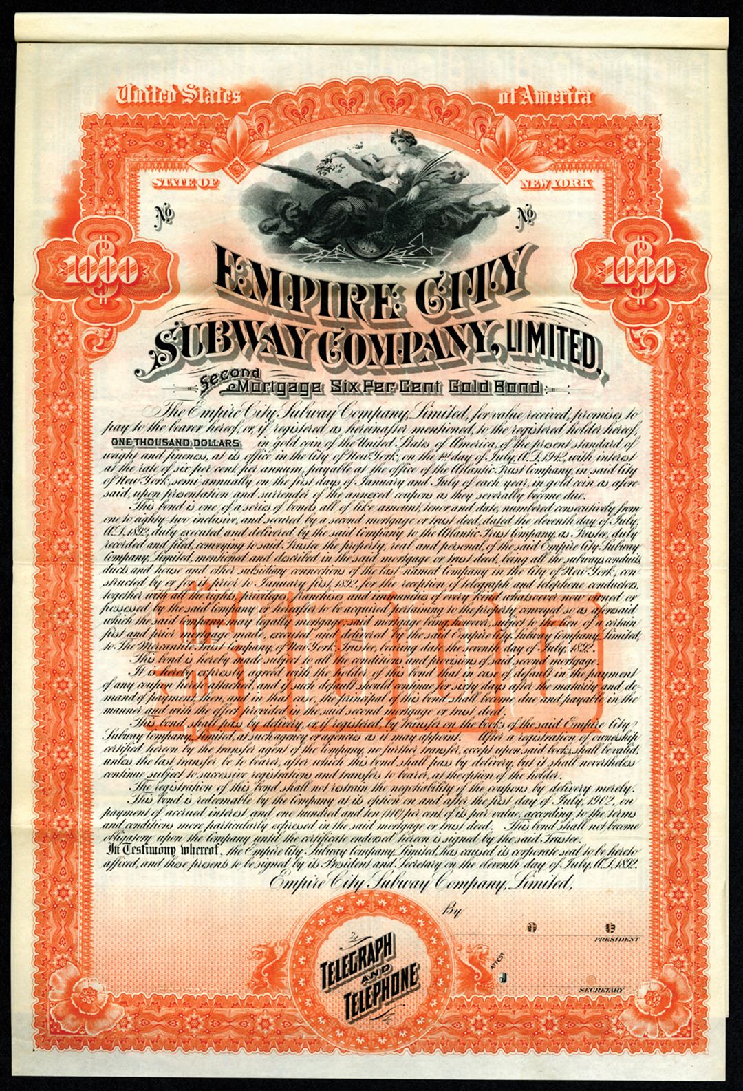 New York, 1892. $1000 Specimen 6% Second Mortgage Gold Coupon Bond, Black text with orange border and undertint, Reclining allegorical figure at top. POCs, VF condition. Unlisted color in Cox, Very Rare. The company was formed in 1891 as part of a plan for common utility ducts to consolidate all utilities including railroads underground. Incompatibility among the utilities limited the range of utilities that could share their ducts, so the company now operates as a wholly owned subsidiary of Verizon New York Telephone under a franchise from the city. In addition to Verizon, the company provides service to cable television and other telephone companies.
