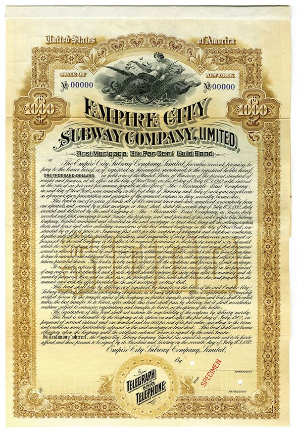 New York, 1892. $1000 Specimen 6% First Mortgage Gold Coupon Bond, Black text with brown border and underprint, Allegorical woman reclining on winged wheel at top center. Red specimen overprint, 00000 serial numbers, and POCs. Fine condition, FBN. Empire City Subway is an American company in New York City which is responsible for maintaining underground conduits in Manhattan and The Bronx, and the manholes by which those conduits are accessed. The company was formed in 1891 as part of a plan for common utility ducts to consolidate all utilities underground. Incompatibility among the utilities limited the range of utilities that could share their ducts, so the company now operates as a wholly owned subsidiary of Verizon New York Telephone under a franchise from the city.