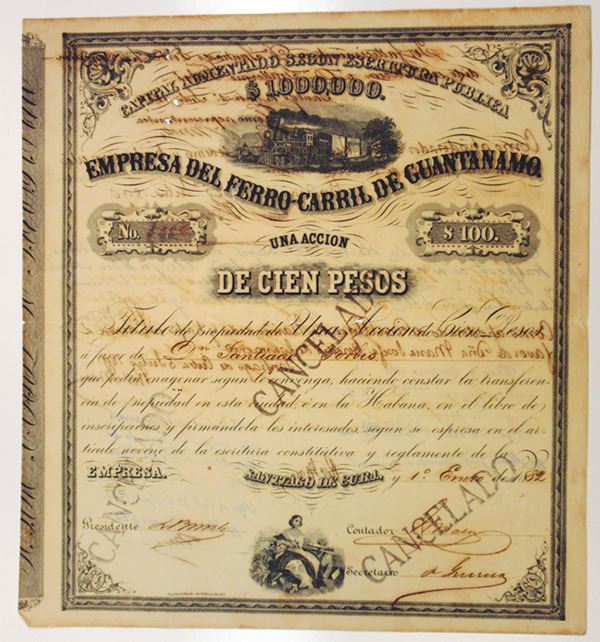 Cuba. 100 Pesos Issued and Cancelled Odd% Bond, Black print on black border printed in Spanish, Locomotive moving down tracks at top, Multiple stamped out cancelled, Fine condition with toning.