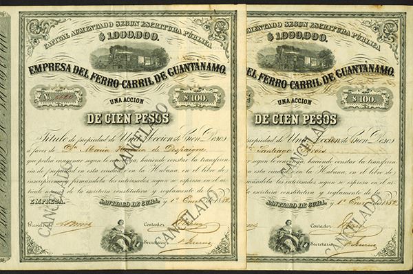 Cuba, Lot of 2 stock certificates, both for 10 Pesos = 1 Share. Black on light tan paper, Fine to VF.