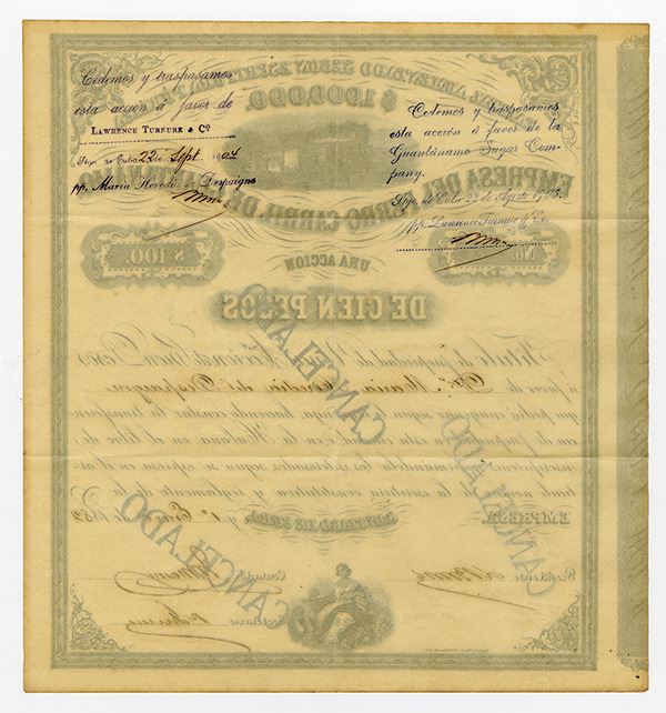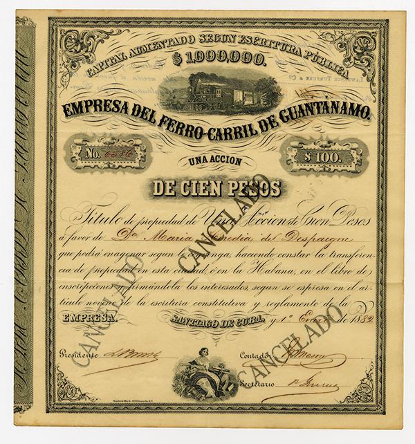 Santiago De Cuba, Cuba, 10 Pesos = $100 = 1 Share. Locomotive at top and allegorical woman at bottom, Black on light tan paper, Fine to VF.