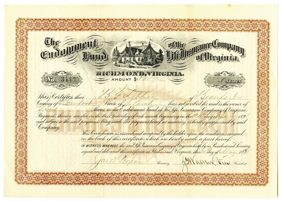 Virginia, 1893. 5 Shares I/U Stock Certificate, Black text with brown border and underprint, Small illustration of a building at top center. Fine condition. The Life Insurance Company of Virginia is a life insurance company founded in Petersburg, Virginia, United States, in 1871. By the early twentieth century, the Life Insurance Company of Virginia offered an array of products, including whole life annuities through its ÒOrdinary DivisionÓ, term life products, endowment policies, and limited payment policies through its ÒIntermediate DivisionÓ, and a set of products for the workplace through an industrial arm.