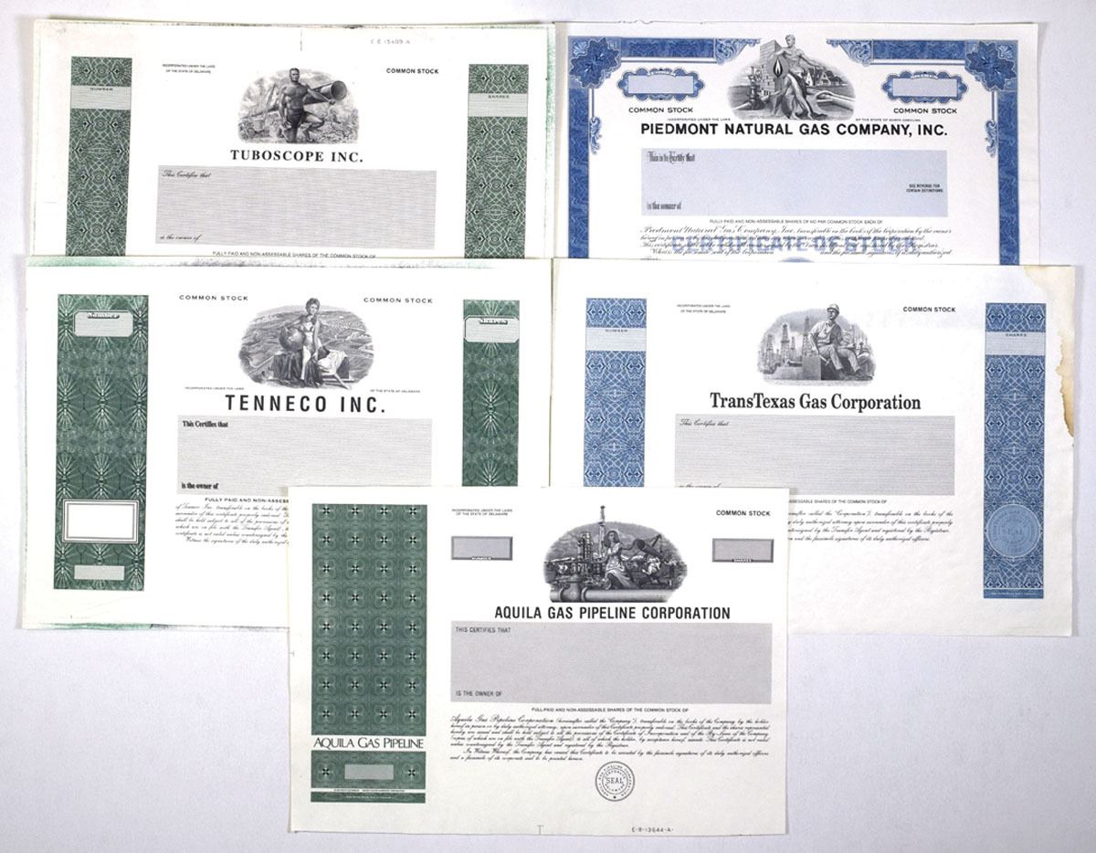 Lot of 5 items, featuring energy and gas companies, including Tuboscope Inc., manufacturer of tubular products and services, green border; Piedmont Natural Gas Company, Inc., natural gas distributor in the Southeastern United States, blue border; Tenneco Inc., a diversified industrial conglomerate, green border; TransTexas Gas Corporation, natural gas production company, blue border; and Aquila Gas Pipeline Corporation, natural gas pipeline operator, green border. All certificates are face-only with blank reverses. Printed by the American Bank Note Company. Overall condition is Very Fine to Uncirculated.