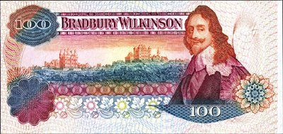 1970-80. P-Unlisted. 100 Tyvek banknote. Experimental Tyvek note. Multi-color cycloid undertint. Multi-color vignette of Shakespeare and castles. Uniface. Unc. Rare Tyvek item. BWC.
