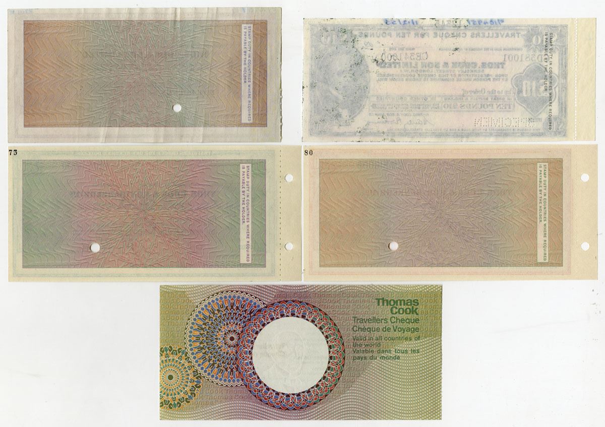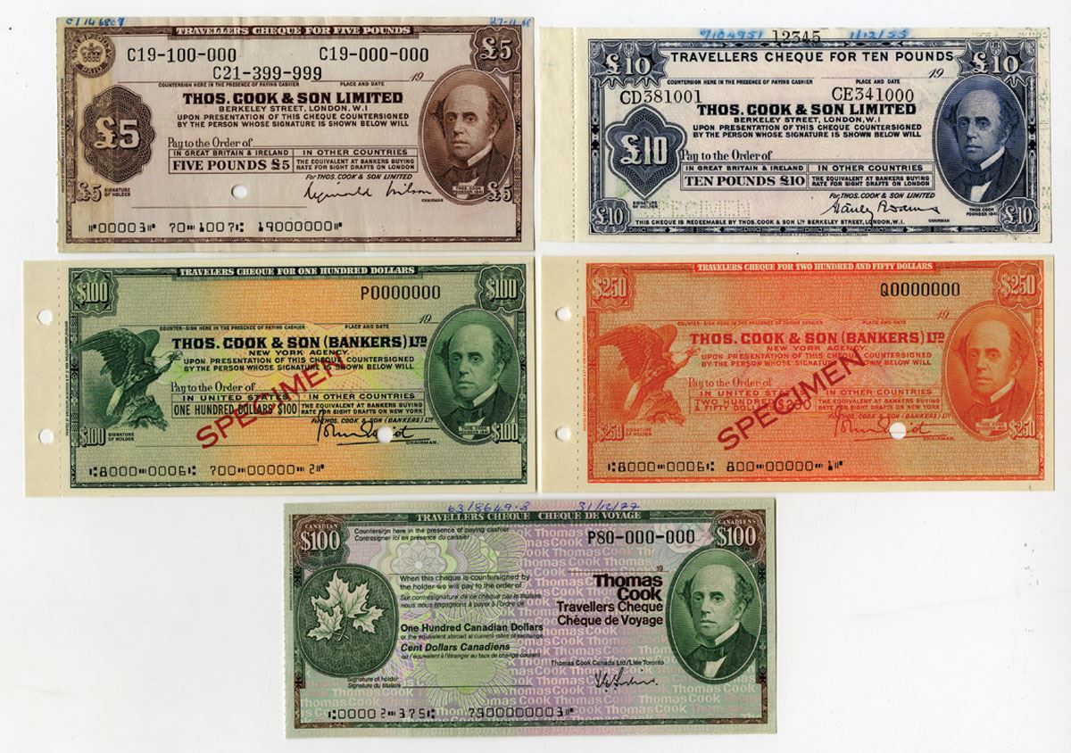 England, Canada, USA, 1955-1980s. Lot of 5 Specimen Cheques, all with portrait of Thomas Cook on right, Includes 100 Canadian Dollars printed in Green and Brown with maple leaf at left, 1977; 5 Pounds with Brown-purple printing, 1968; 10 Pounds with Blue printing, 1955; 100 Dollars printed in Green, ND (1980s); and, 250 Dollars printed in orange, ND (1980s). Cheques are all marked Specimen with either overprints and POCs, the U.K. 5 pounds is in VF, the balance are in Unc. to CU condition. BWC (5). Sold "AS IS" no returns accepted.