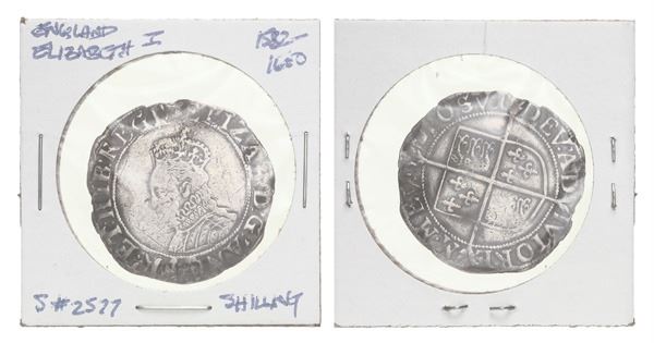 this lot spans mintages from 1550 to 1605, covering the reigns of Edward VI to James I. Included are an Edward VI (1550-1551) cut penny, S-2474, a practice that led to design changes to facilitate the creation of small change and deter clipping; a Mary (1553-1554) groat, S-2492; a Philip & Mary (1554-1558) groat, S-2508; Elizabeth I coins from 1559 to 1600, including pennies, groats, six pence, and shillings with catalog numbers S-2553, S-2562A, S-2563 (2), S-2573, S-2565, S-2577, S-2579; and James I coins from 1602 to 1605, with a thistle merk, S-5497 (as James VI of Scotland), and a half penny, S-2663. This assemblage chronicles the evolution of English silver coinage, marked by the reigns of Edward VI, Mary, Philip & Mary, Elizabeth I, and James I (14 coins). (photo on web site)