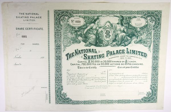 England. 189- (1895 written on lower left). Specimen Bradbury, Wilkinson & Co. stock certificate. Odd Shares. Counterfoil on left. Printed in green on white. Ornate border and outstanding large vignette of 2 allegorical women holding hands over logo of letters. Ornate flourishes surround them. Pin punch "Specimen - Bradbury Wilkinson & Co. London" in signature block. Serial # 0001 to #0250 refers to how many were to be printed. Early English sports related stock certificate. XF condition. BWC. Rare certificate.