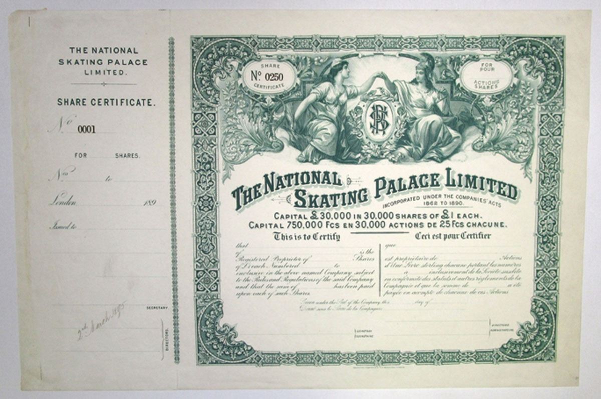England. 189- (1895 written on lower left). Specimen Bradbury, Wilkinson & Co. stock certificate. Odd Shares. Counterfoil on left. Printed in green on white. Ornate border and outstanding large vignette of 2 allegorical women holding hands over logo of letters. Ornate flourishes surround them. Pin punch "Specimen - Bradbury Wilkinson & Co. London" in signature block. Serial # 0001 to #0250 refers to how many were to be printed. Early English sports related stock certificate. XF condition. BWC. Rare certificate.