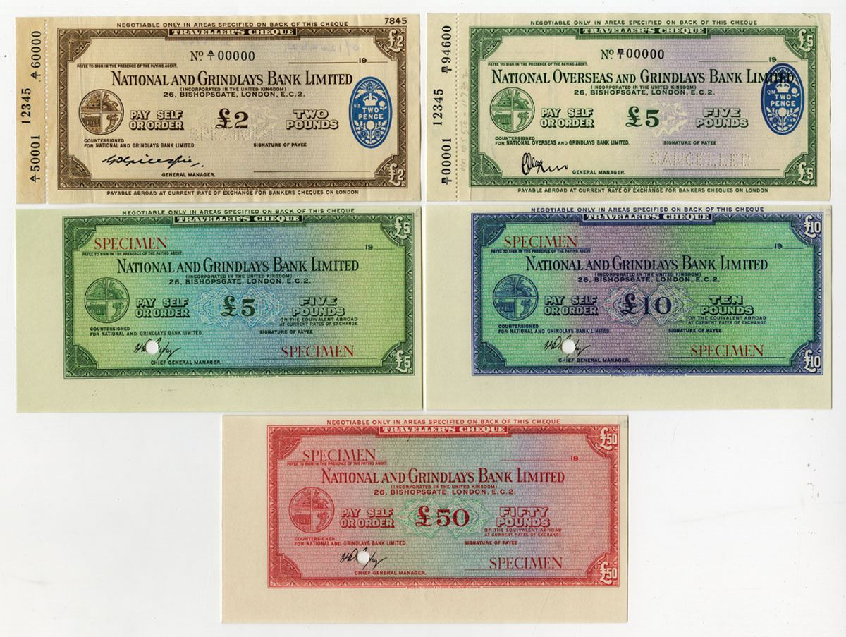 London, England, ND (1950-60s). Lot of 5 Specimen Travelers Cheques, Includes: National and Grindlays Bank Ltd. 2 Pounds, 5 Pounds, 10 Pounds, and 50 Pounds; National Overseas and Grindlays Bank Ltd. 5 Pounds. All are marked Specimen with either overprints or pin punches, all are in Choice AU to CU condition, and all printed by BWC. (5). Sold "AS IS" no returns accepted.
